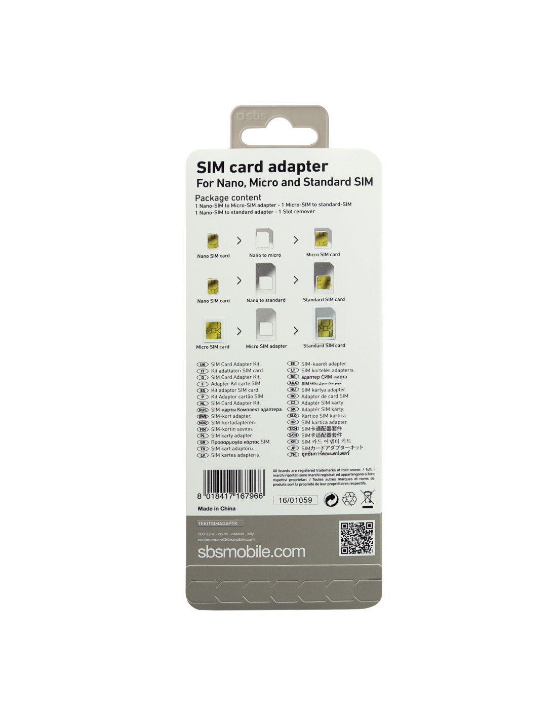 Gli smartphone di oggi hanno Sim differenti e quando si devono cambiare, o momentaneamente sostituire, puntualmente la scheda Sim di uno smartphone non è compatibile con l’altro.Grazie all’adattatore per nano Sim e micro Sim di SBS questo non sarà più un problema; permette infatti di trasformare una micro Sim ad una Sim standard, oppure una nano Sim ad una micro Sim o standard.Dotato inoltre del pratico accessorio per la rimozione sicura della scheda Sima dallo smartphone.Caratteristiche: