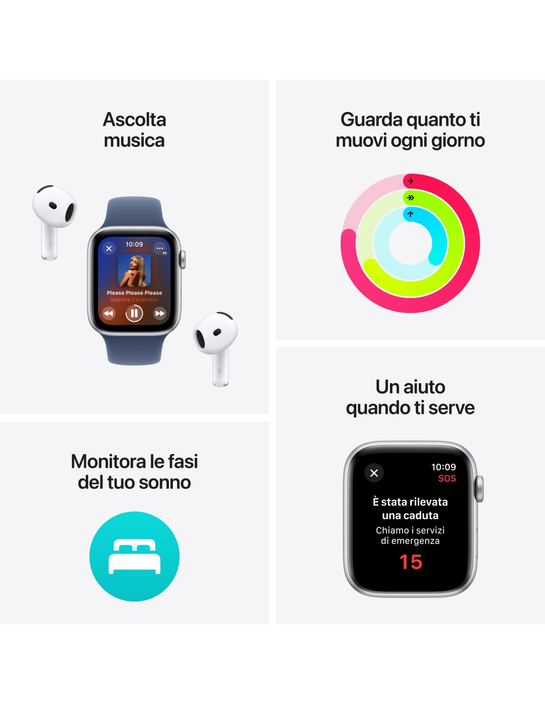 Ha tutto per farsi amare.\nHa funzioni essenziali per restare in contatto con chi vuoi e vivere una vita attiva, sana e sicura.\n\n• PERCHÉ APPLE WATCH SE – Ti dà tutto l’essenziale per motivarti e far