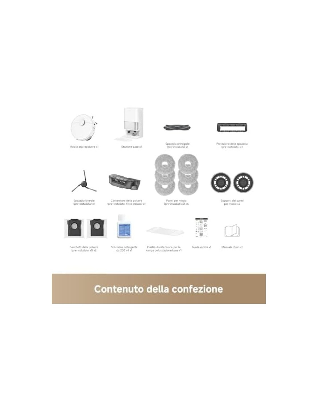 - Stazione base, Spazzola principale (pre-installata), Protezione della spazzola (pre-installata), Spazzola laterale (pre-installata), Contenitore della polvere (pre-installato, filtro incluso), Panni p