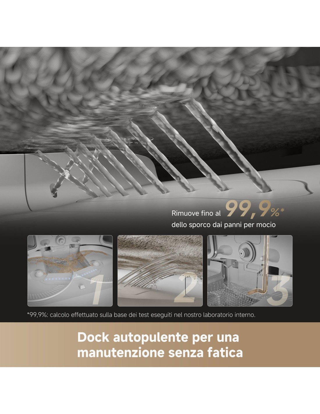 Aspirazione Vormax da 30.000 Pa: Potenza estrema per rimuovere polvere, peli e lettiera per gatti anche dai tappeti. Auto-pulizia ThermoHub a 100°C: Lavaggio dei moci con acqua bollente per scioglier