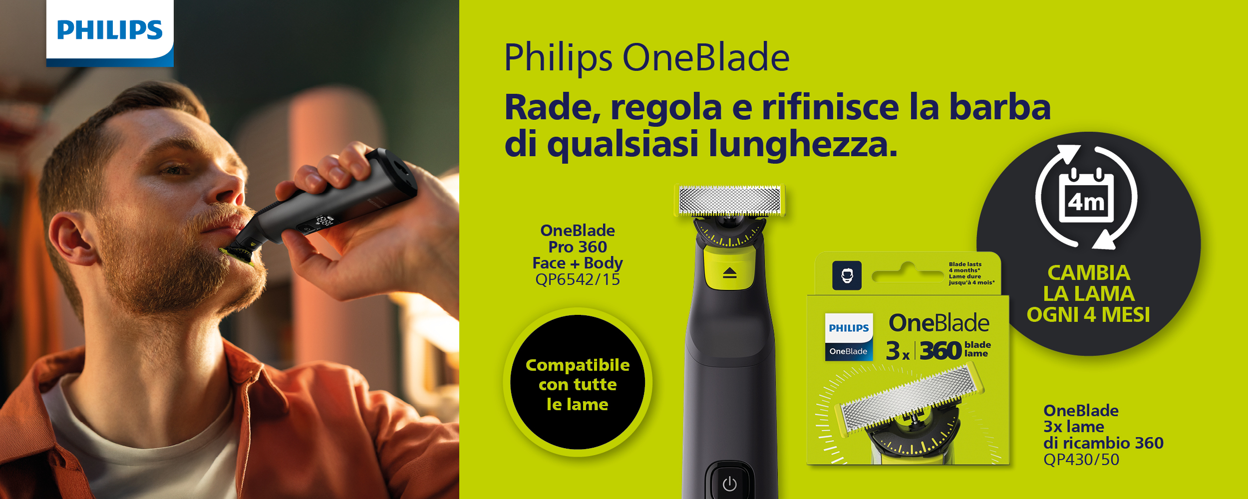 Scopri Philips OneBlade Pro 360, il sistema completo che unisce precisione, comfort e praticità. Un solo strumento per curare barba, baffi e corpo, grazie alla lama 360 che segue le linee del viso con movimenti naturali e precisi.