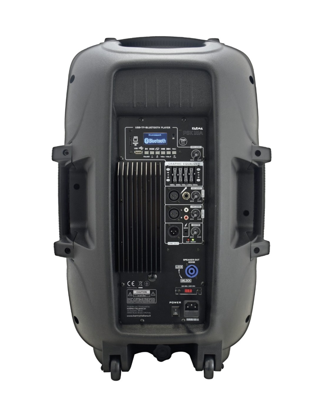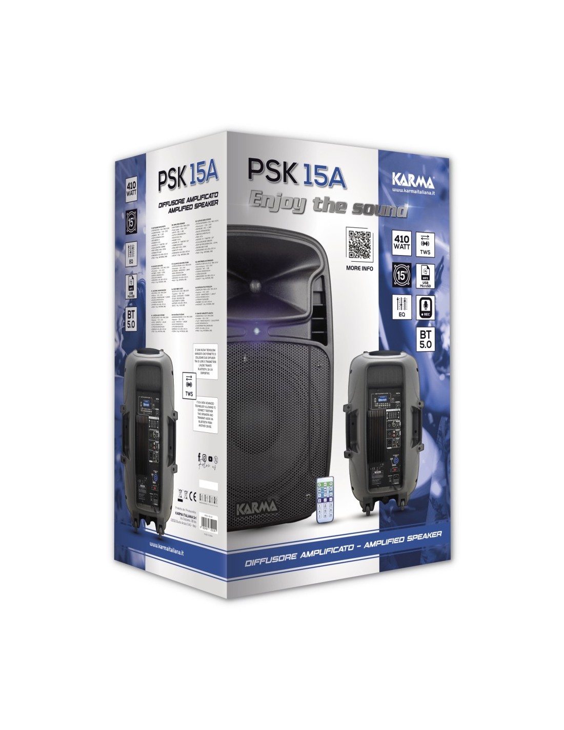 L\'ampia griglia metallica nasconde un potente woofer da 15\" e un tweeter da 2\"; il diffusore sprigiona una potenza massima di ben 410W con possibilità di amplificare un box passivo della stessa potenz