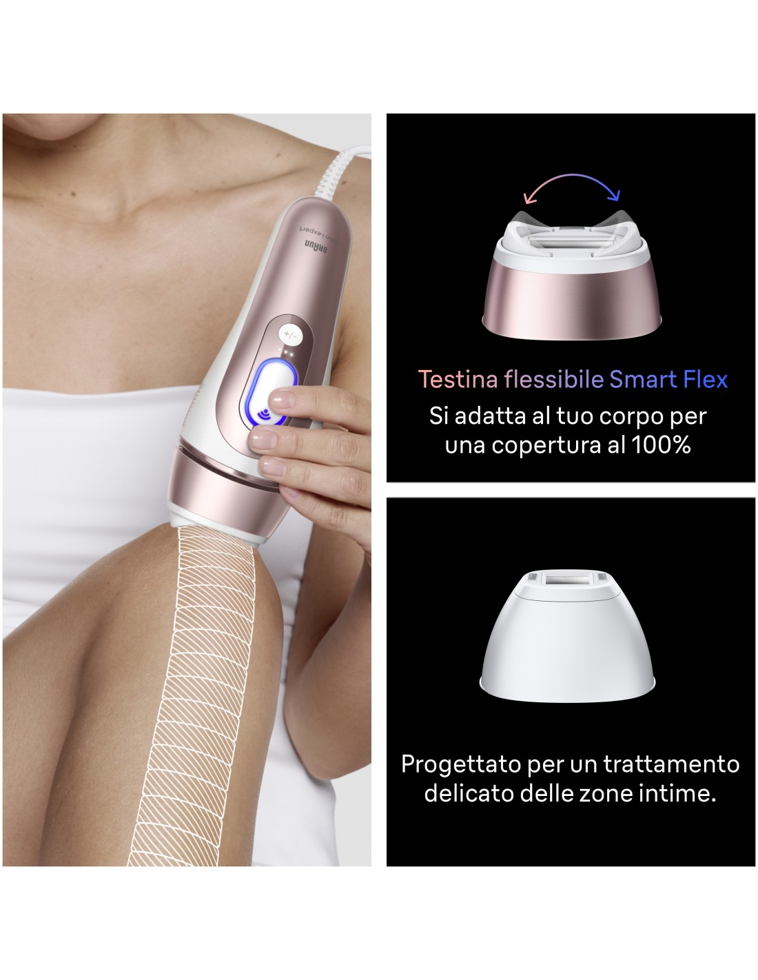 Scopri il la nostra migliore luce pulsata per una rimozione dei peli efficace e delicata nel comfort di casa tua. La prima Luce Pulsata Smart al mondo che apprende e si adatta a te. Nessuna preoccupaz