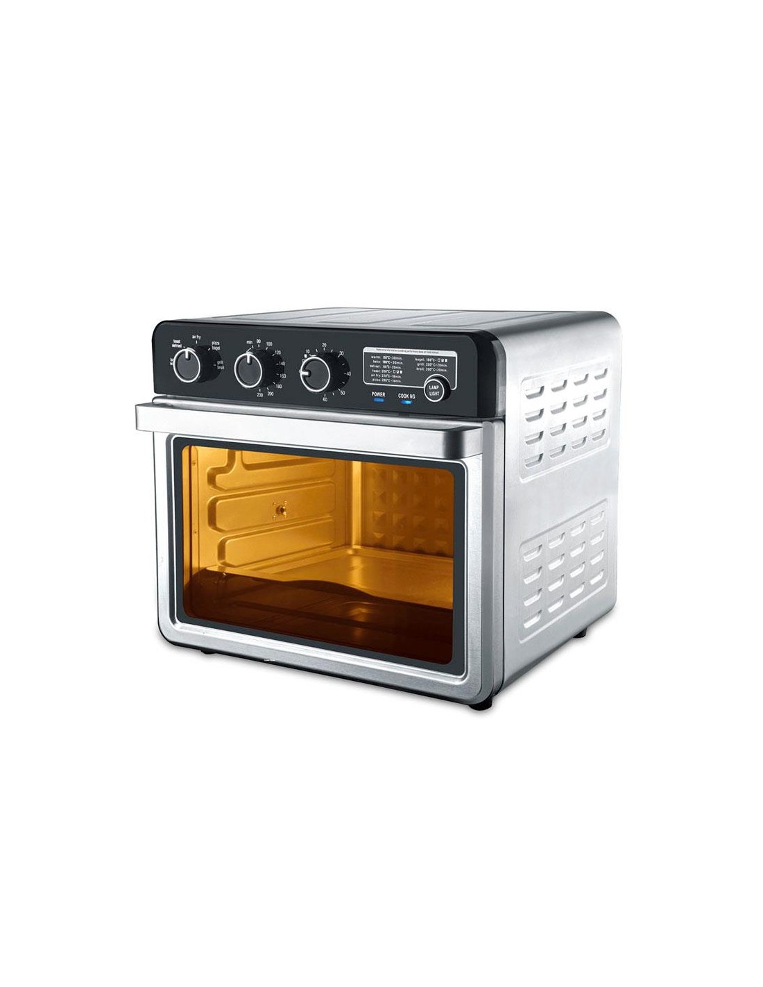 - 3 Manopole di controllo\n9 funzioni in 1: Frittura ad aria, toast, barbecue, grill, forno, bagel, pizza calda, scongelamento\n3 spie di accensione/Funzionamento\nElementi in acciaio riscaldante in acciai