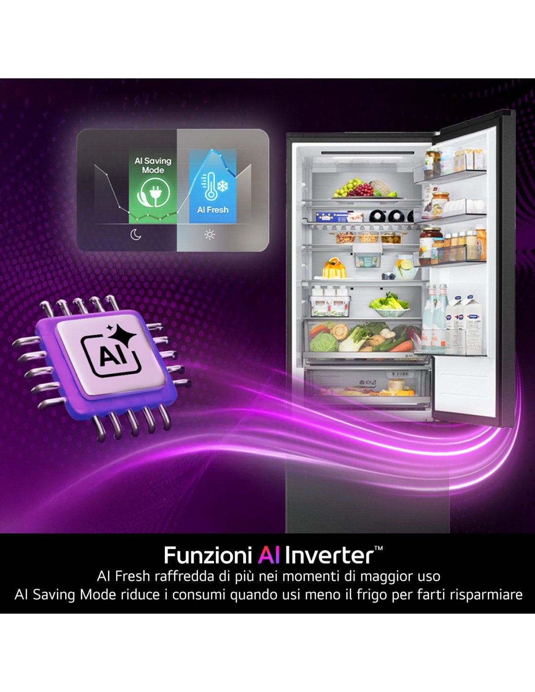 GBBS726BEV Frigorifero combinato Fit & Max 60cm, Classe B, 375L, AI Inverter, Black Steel