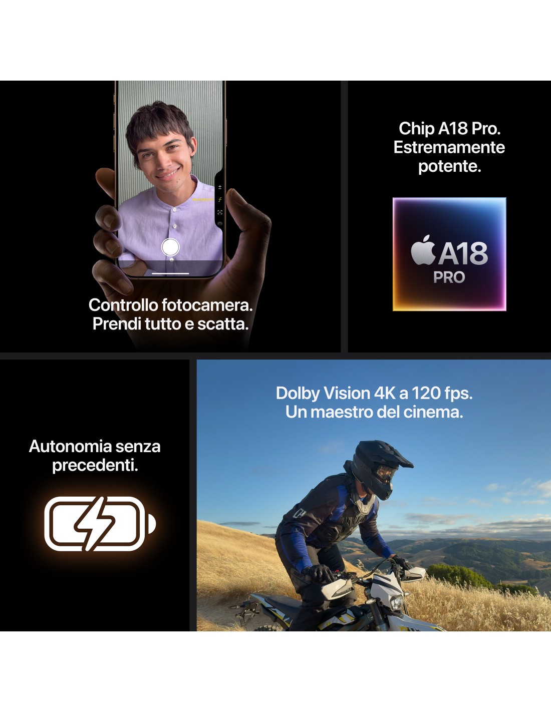 Estremamente potente.\niPhone 16 Pro Max. Splendido design in titanio. Controllo fotocamera. Dolby Vision 4K a 120 fps. E chip A18 Pro.\n\nCaratteristiche principali\n- SPLENDIDO DESIGN IN TITANIO — iPho
