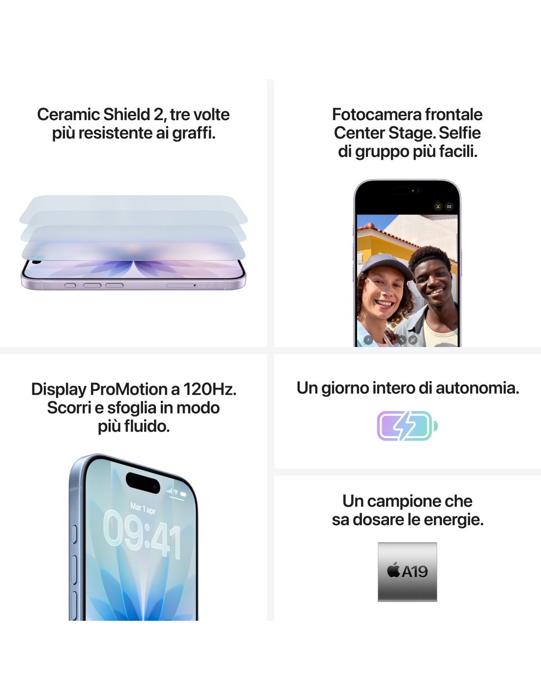Fantasticolor. iPhone 17. Sempre più bello. Sempre più robusto. Display ProMotion da 6,3\", Ceramic Shield 2, fotocamere posteriori tutte da 48MP, fotocamera frontale Center Stage, chip A19 e molto alt