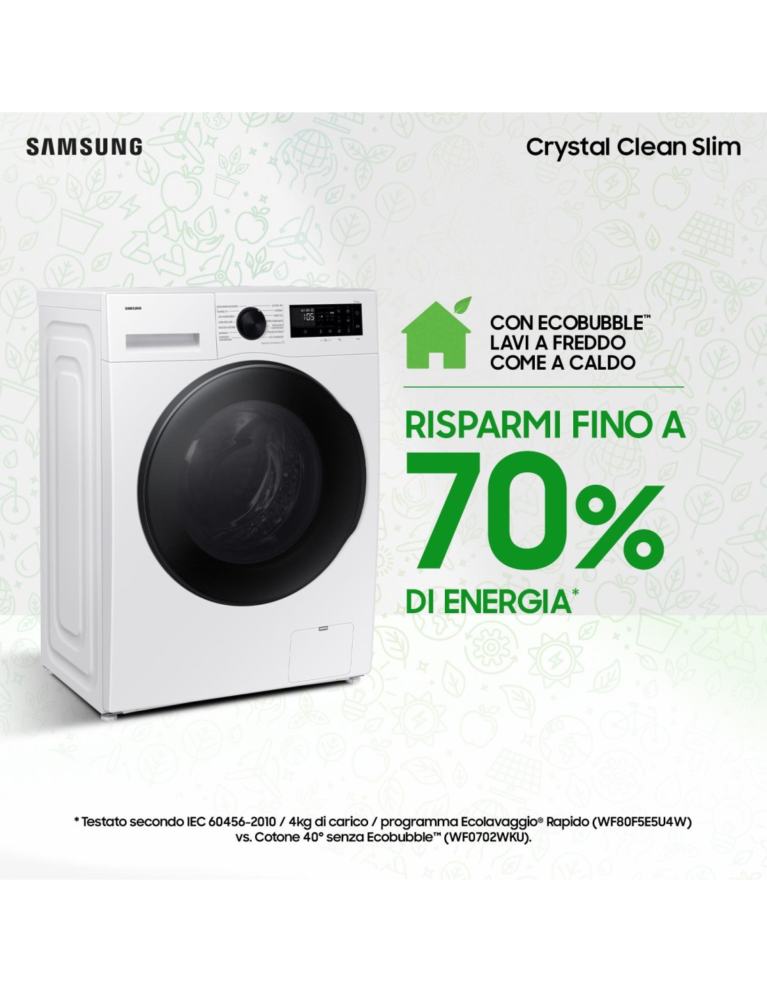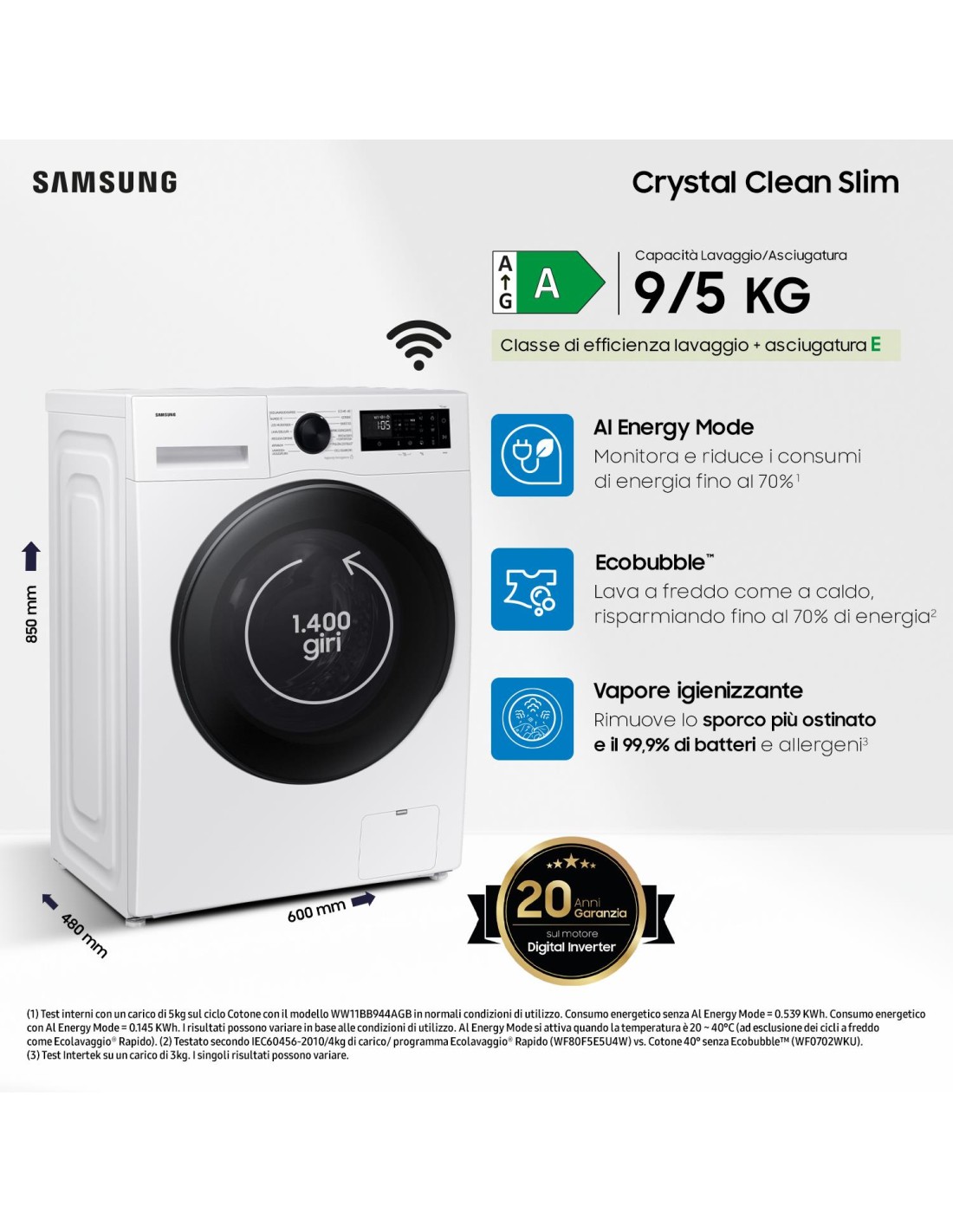 - La lavasciuga Samsung WD90DG5G34BEET Crystal Clean è una lavasciuga slim che porta innovazione, potenza e design elegante in un prodotto compatto, pensato per chi cerca un bucato perfetto senza rinunc