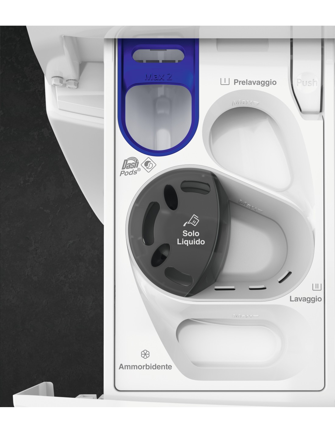 UNIVERSALDOSE, PULITO ECCEZIONALE ANCHE NEI LAVAGGI BREVI E A BASSE TEMPERATURE* Il cassetto UniversalDose ha un design brevettato che permette l\'efficace dissoluzione di tutti i tipi di detersivo, co