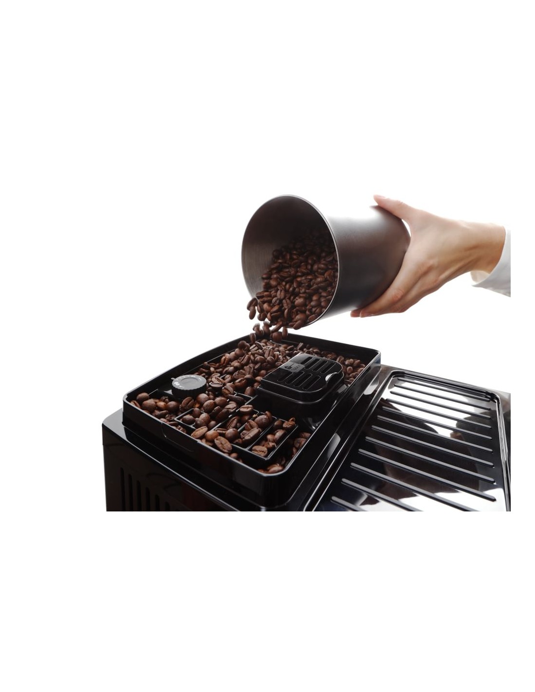 - La macchina può essere utilizzata con i chicchi o con la polvere di caffè. Gruppo infusore estraibile a capacità variabile. Coperchio salva aroma per il contenitore chicchi.