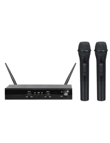 Base ricevente con doppio microfono palmare operanti in banda UHF con un raggio operativo di circa 50mt. La base ricevente è alimentabile tramite normale cavo micro USB (alimentatore in dotazione) mentre i microfoni necessitano di batterie 1,5V di tipo stilo. La base può essere collegata tramite connettore 6,3mm (cavo incluso) ad un comune mixer o amplificatore. I volumi dei due microfoni sono regolabili separatamente. Un led indica lo stato di carica delle batterie.