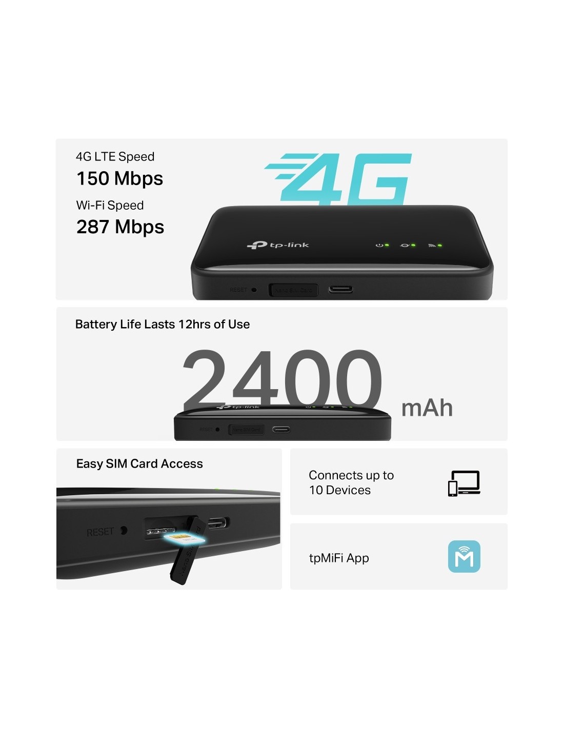 Hotspot Mobile 4G con slot per SIM Card e batteria 2400mAh, Velocità di connessione in download fino a 150Mbps, compatibile con i principali operatori telefonici nel mondo. Velocità Wi-Fi fino a 286Mb