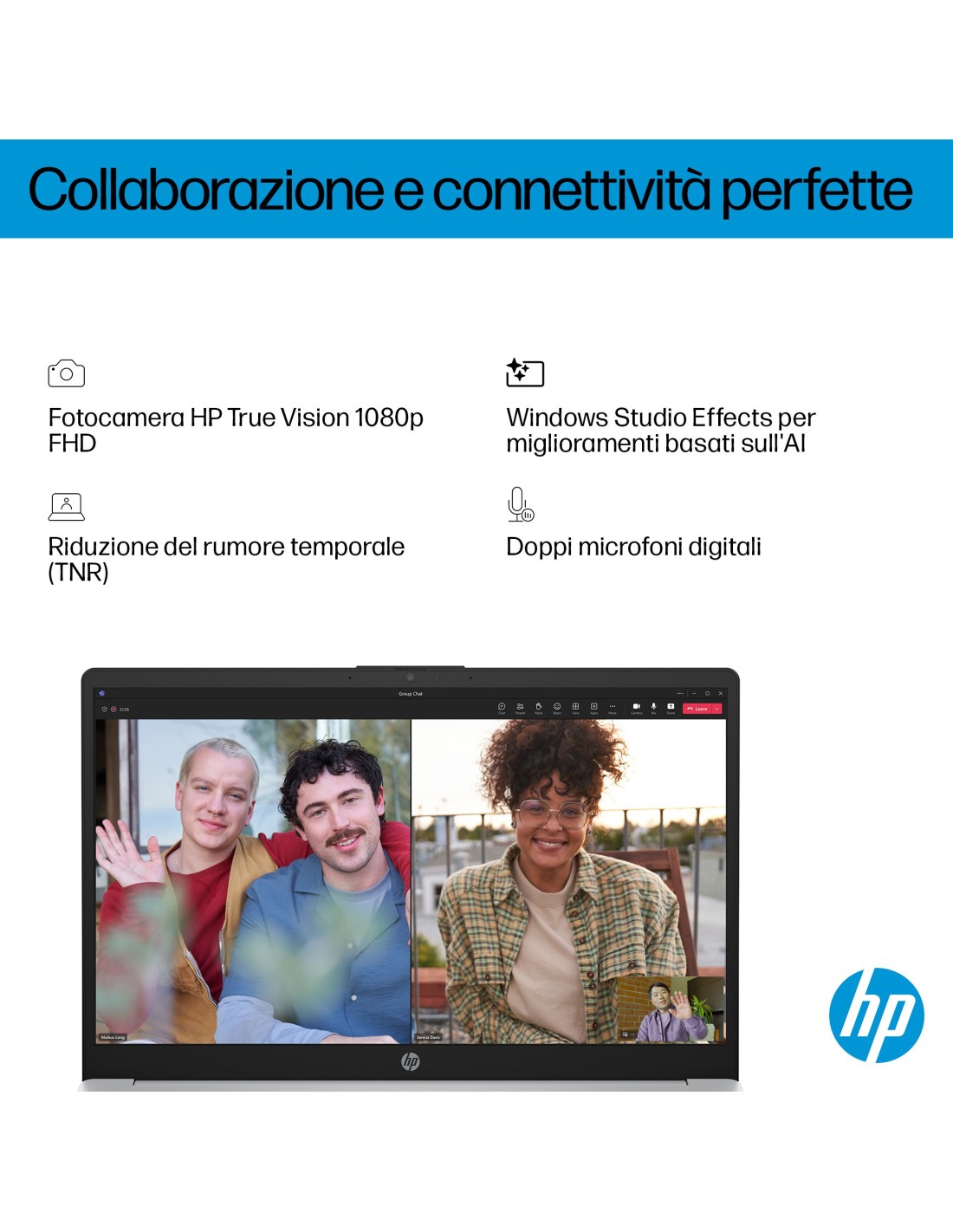 Fotocamera HP True Vision da 1080p FHD con riduzione del rumore temporale e microfoni digitali dual-array integrati Tasto di silenziamento del microfono; otturatore privacy per la fotocamera