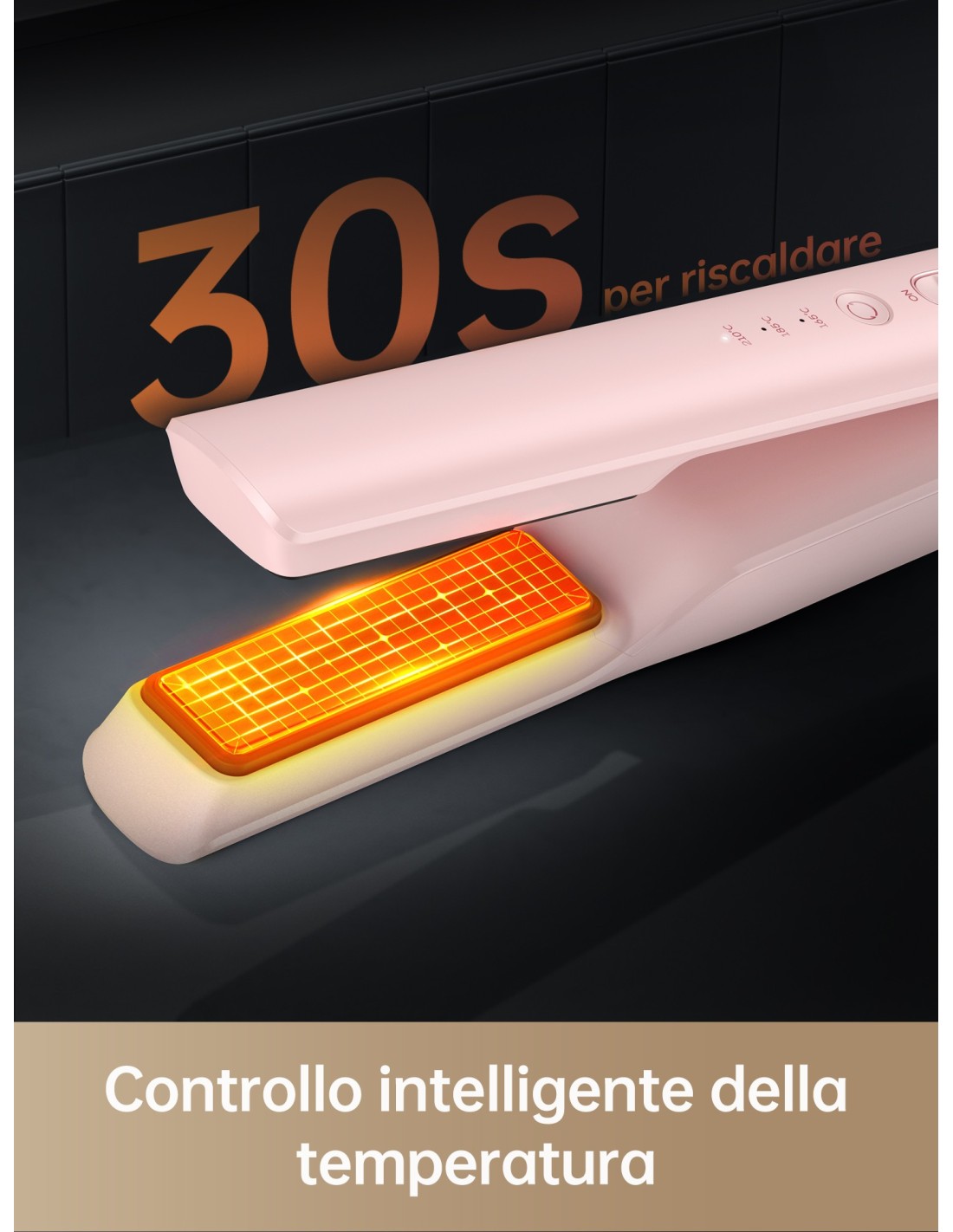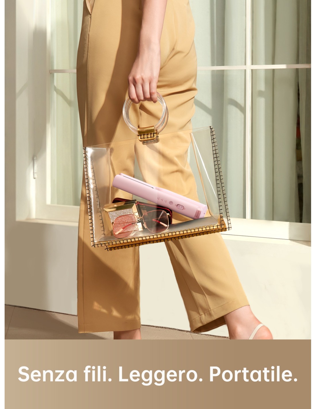 • Design senza fili, leggero e portatile\n• Riscaldamento rapido in 20 secondi\n• Fino a 30 minuti di autonomia\n• 3 livelli di temperatura (165°C / 185°C / 210°C)\n• Tecnologia a ioni negativi anti-cresp
