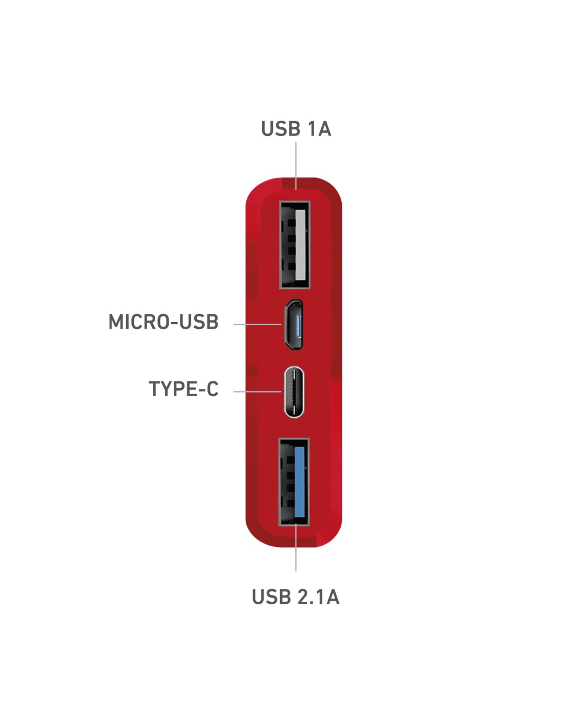 Il power bank è dotato di una porta Micro-USB in cui inserire il cavo con connettori USB a Micro-USB incluso nella confezione per poterlo ricaricare. Nella porta USB-C puoi invece collegare in uscita qualsiasi dispositivo come telefoni smartphone, tablet o eBook compatibili o ricaricare in ingresso il power bank stesso con il cavo in dotazione.