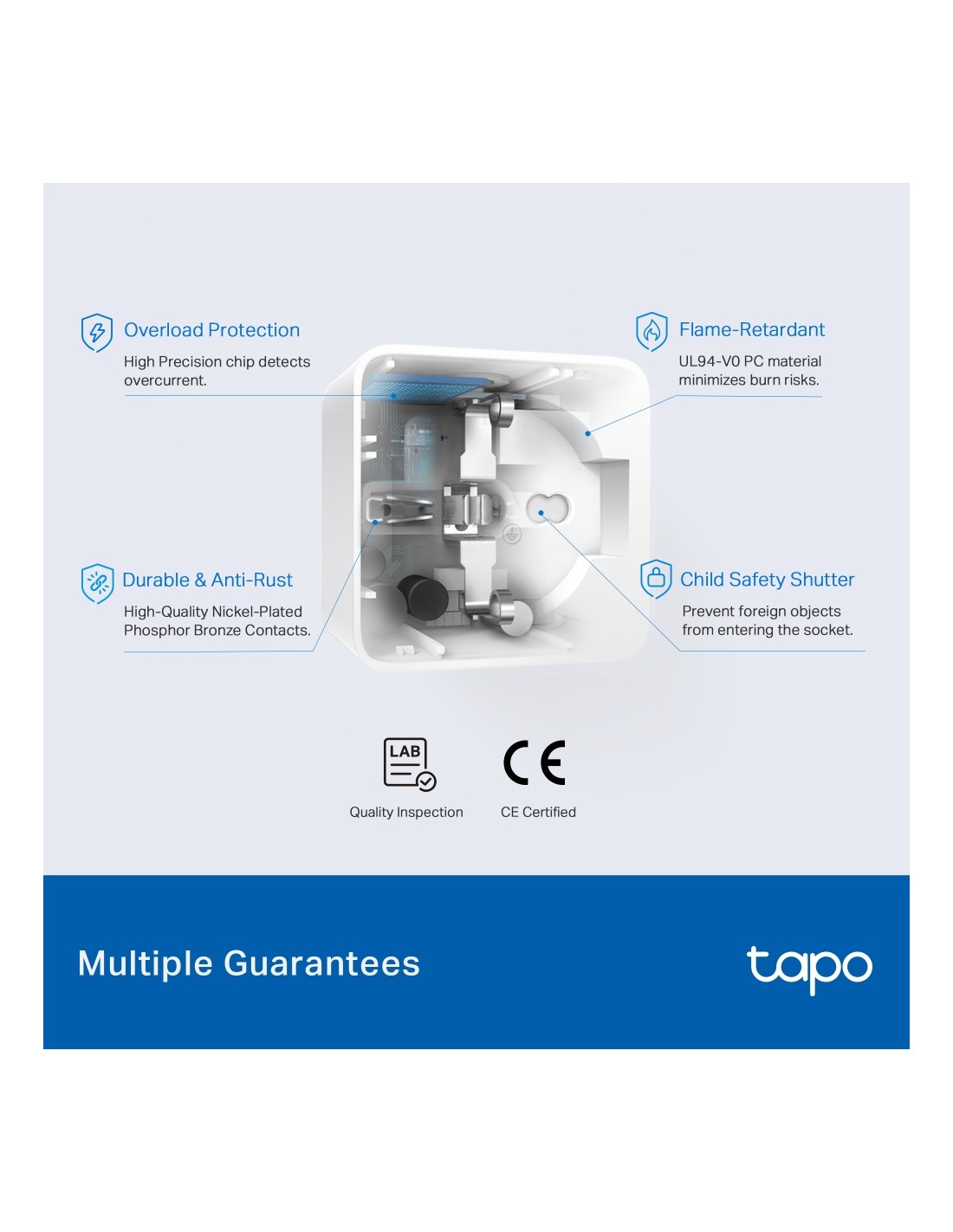Mini presa elettrica smart compatibile con spine di tipo C, F e L, per adattarsi a numerosi tipi di elettrodomestico. Supporta rete Wi-Fi 2.4GHz. Gestione da remoto tramite app Tapo per dispositivi An