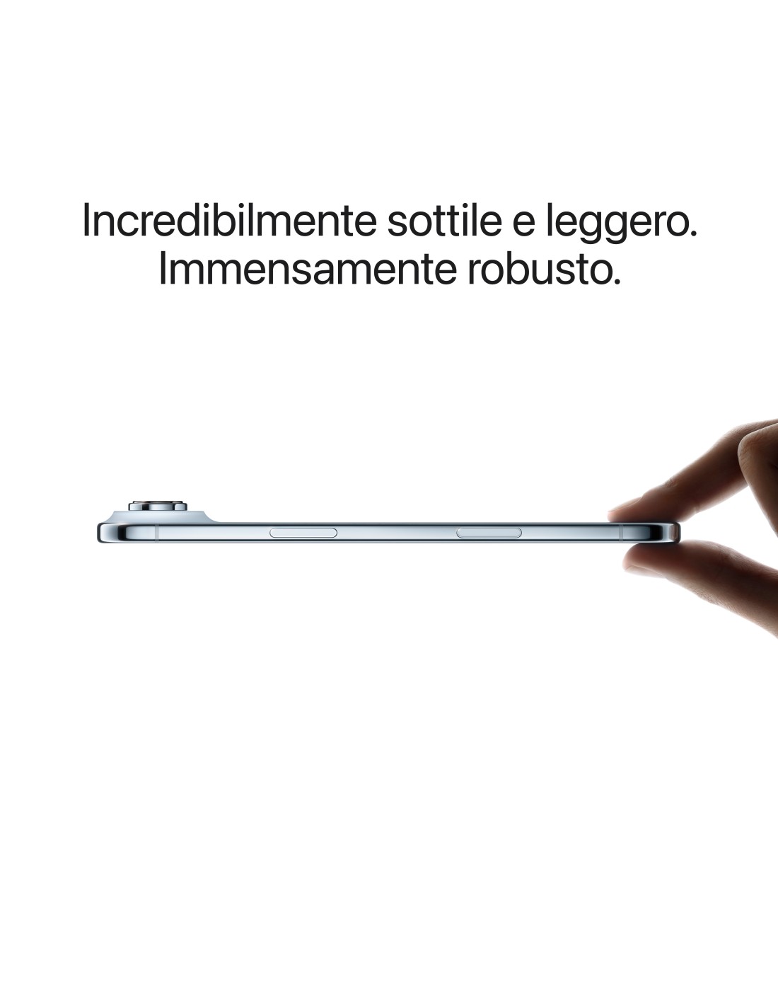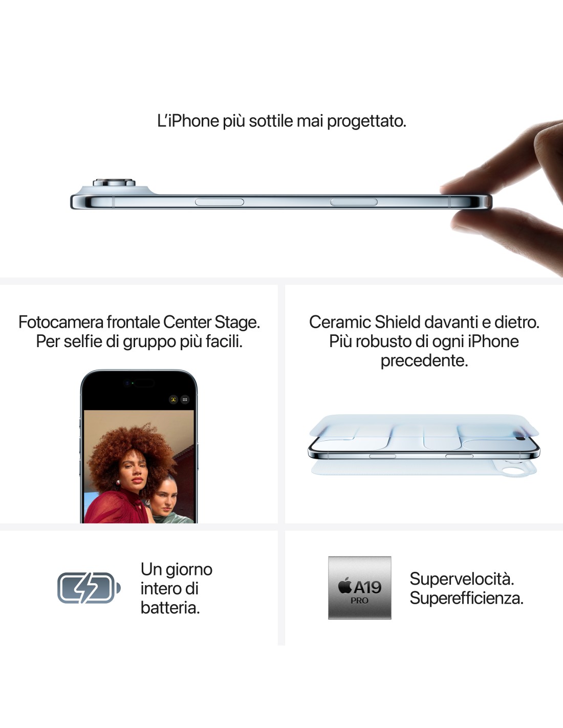 Nuovo iPhone Air.\niPhone Air. L’iPhone più sottile di sempre. Display da 6,5\", robusto Ceramic Shield davanti e dietro, chip A19 Pro, sistema con fotocamera Fusion da 48MP, e fotocamera frontale Cente