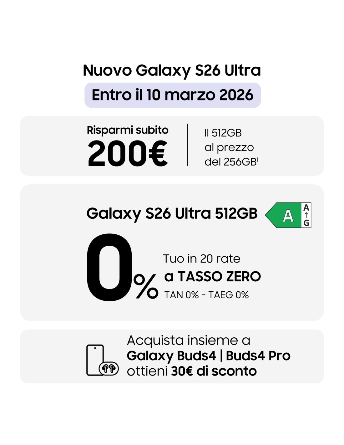 - Scopri Samsung Galaxy S26 Ultra, lo smartphone AI per la prima volta con Privacy Display integrato, la nostra fotocamera più luminosa da 200MP e un processore potente che rende Galaxy AI ancora più in