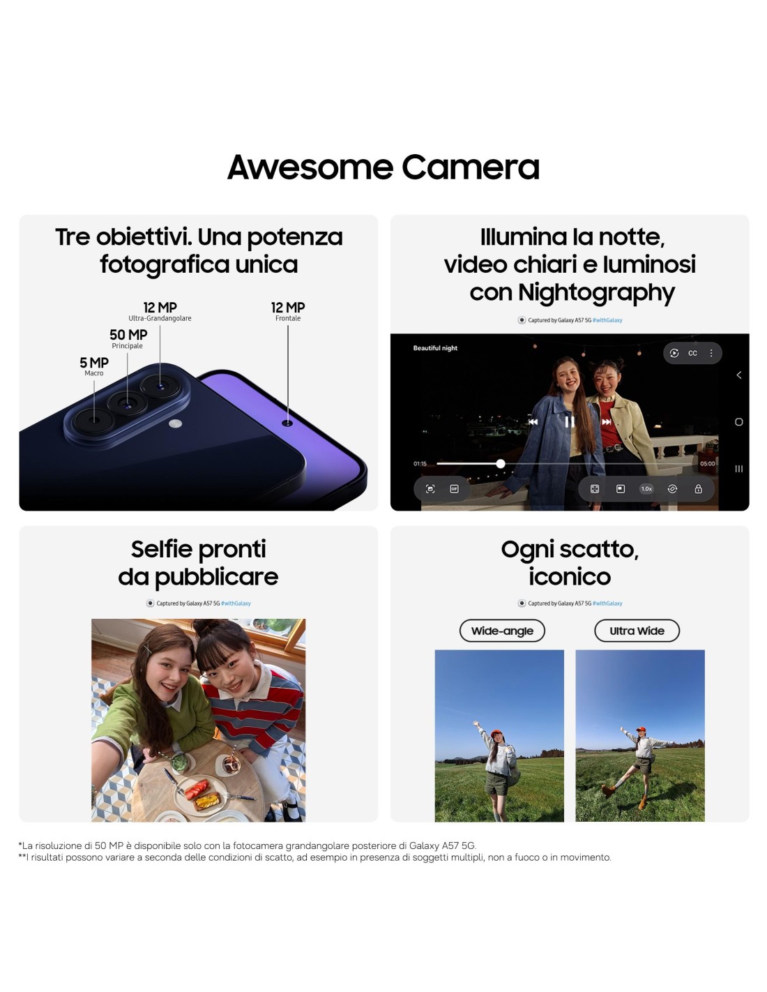 - Scopri Samsung Galaxy A57 5G, più sottile, elegante e fantastico che mai. Cerca in modo intuitivo tutto quello che vuoi sul tuo schermo con Cerchia e Cerca1 e raggiungi nuovi livelli di produttività