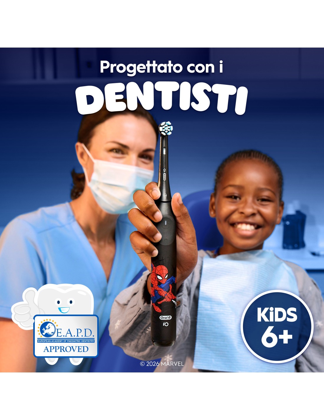 Lo spazzolino elettrico Oral-B iO Kids 6+ offre ai bambini il divertimento con Spiderman insieme alla pulizia delicata ed efficace di uno spazzolino Oral-B progettato con e approvato dai dentisti. iO