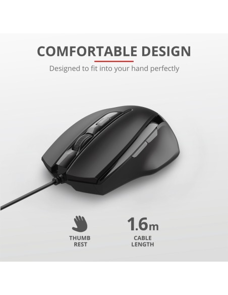 Comfort e personalizzazione Con il design confortevole e quattro impostazioni diverse della velocità, il mouse Trust Voca Comfortable abbina la personalizzazione alla semplicità di utilizzo. Grazie alla semplice installazione Plug and Play, puoi iniziare subito a usare il mouse.