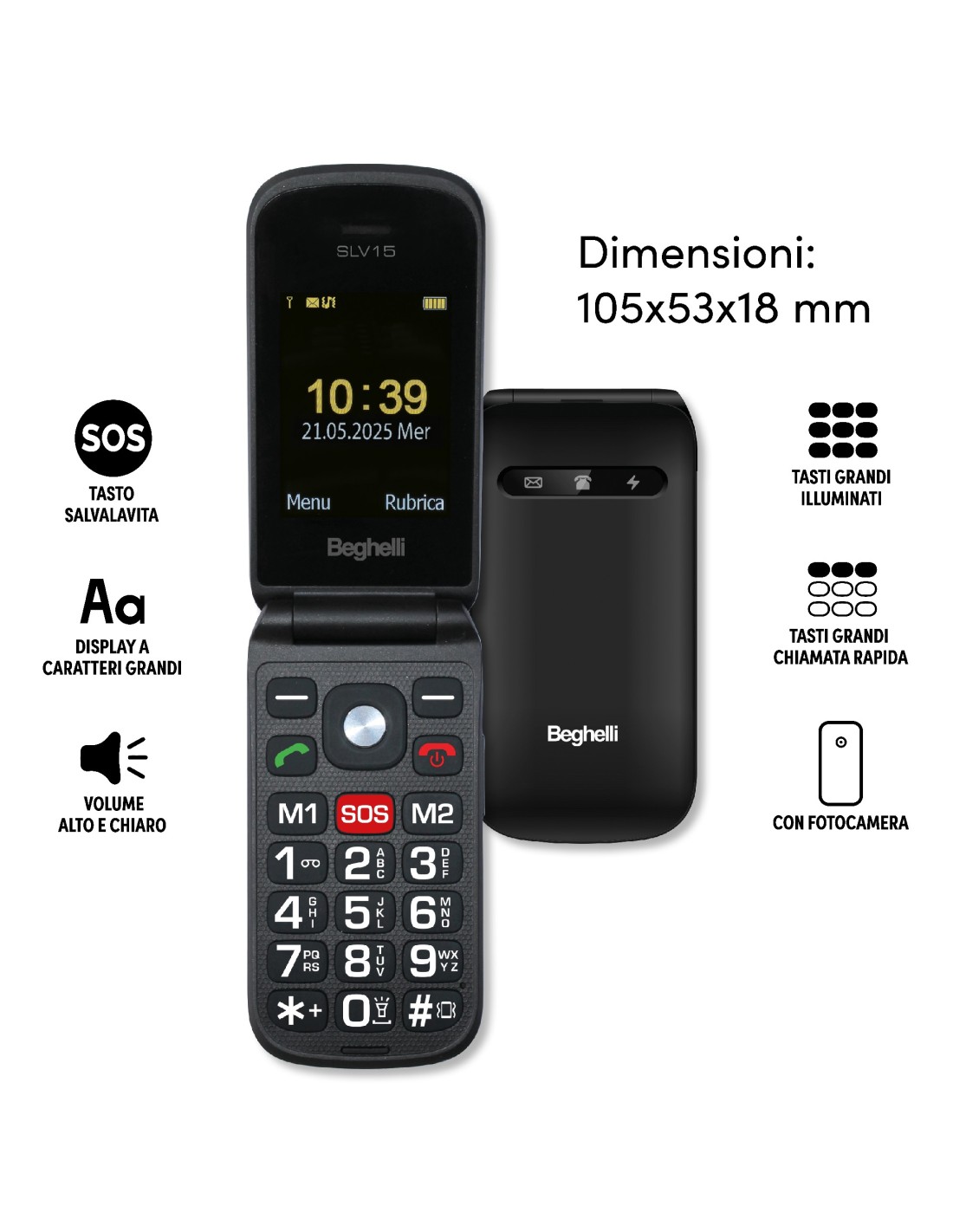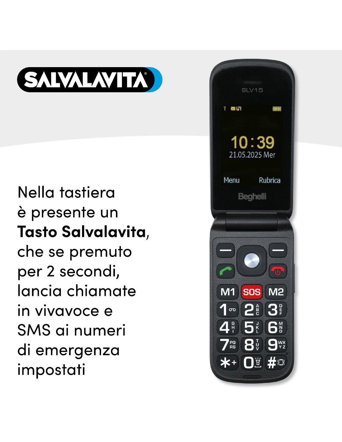 Salvalavita Phone SLV15 ECODESIGN è un telefono semplice da usare, con grandi tasti numerici retroilluminati e un display chiaro e ben visibile. Nella tastiera è presente un tasto Salvalavita che se p