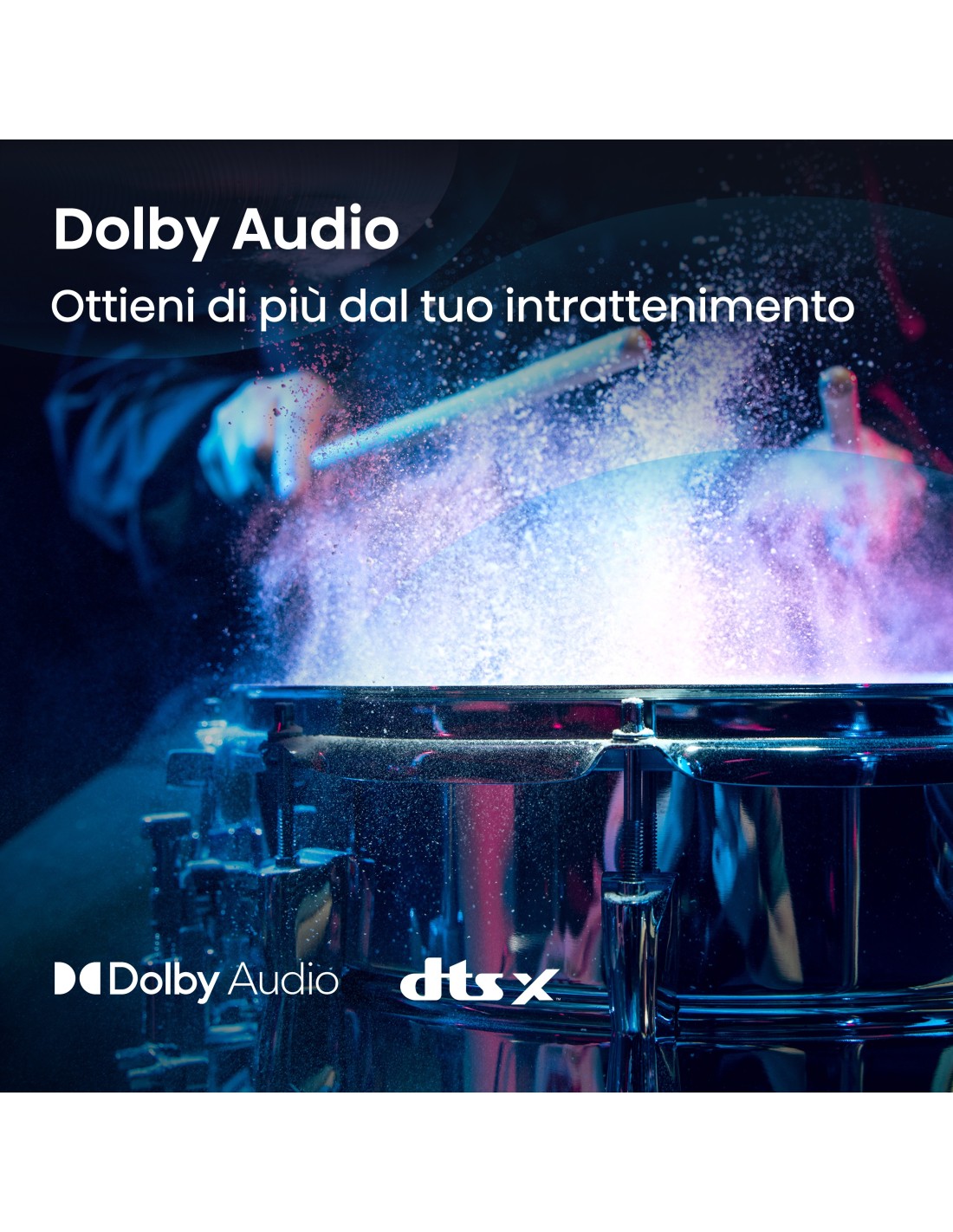 - Audio DTS HD\nUscita Cuffie Doppio Audio\nSintonizzatore TV T2/S2 HEVC + Hotel Mode\nAirplay2