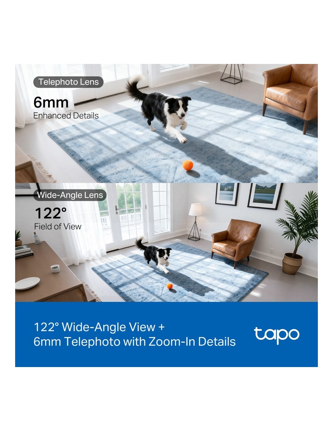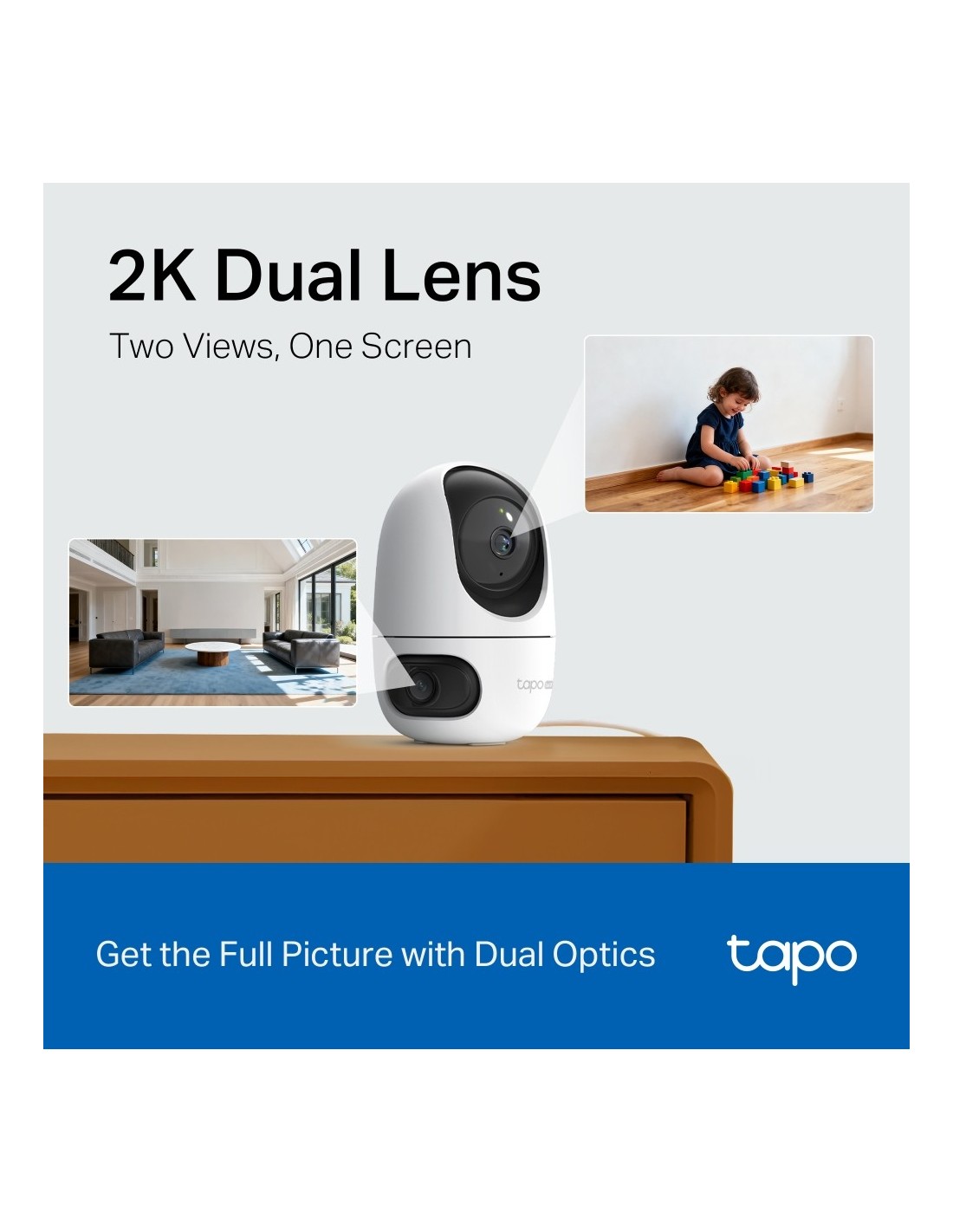 - Tapo C245D cattura immagini nitide e ricche di dettagli con risoluzione 2K 3MP (2304×1296 px) ed è dotata di un doppio obiettivo che assicura una copertura completa. L’obiettivo grandangolare inferior