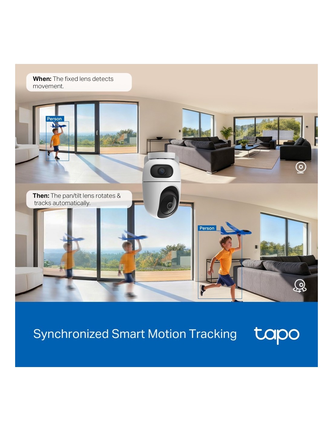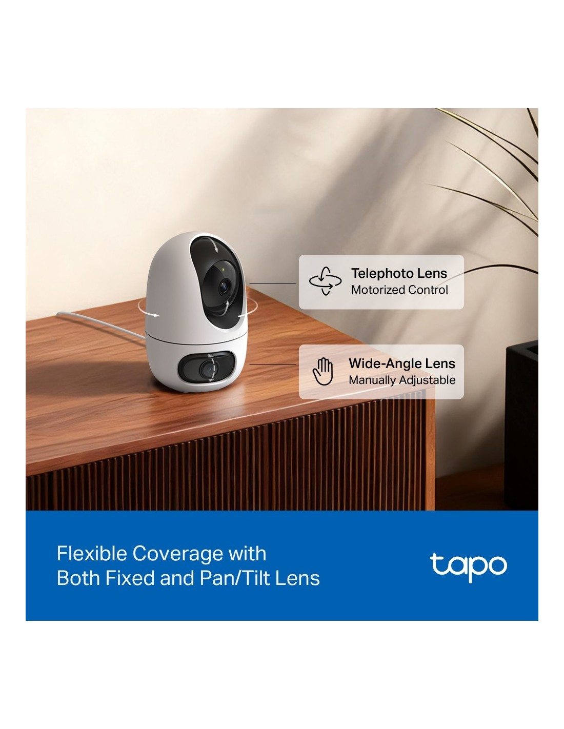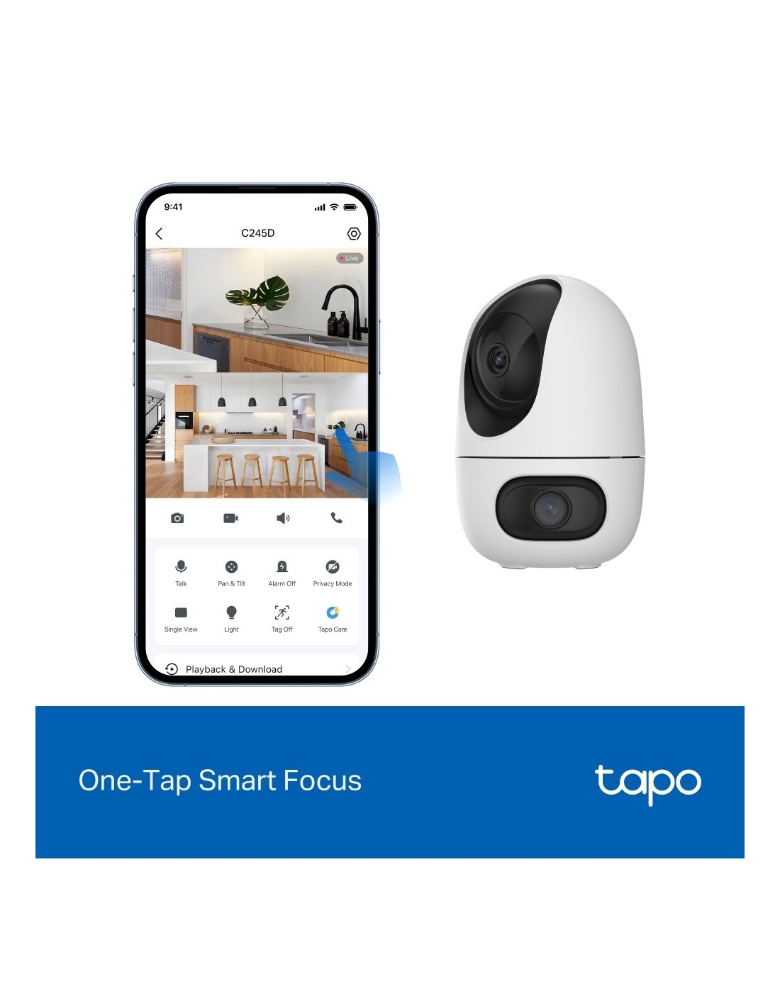 - Tapo C245D è la telecamera motorizzata Pan/Tilt 2K 3MP con doppio obiettivo perfetta per la sorveglianza indoor. I due obiettivi – grandangolare e teleobiettivo – offrono una visione a 360° e la possi